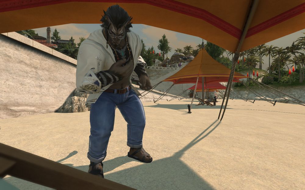 You're on vacation, lounging under a canopy in Mist when you realize you need a drink. Ringing to summon a waiter, you glance up to find a tall, casually dressed hrothgar answered the call instead. He bows to you.