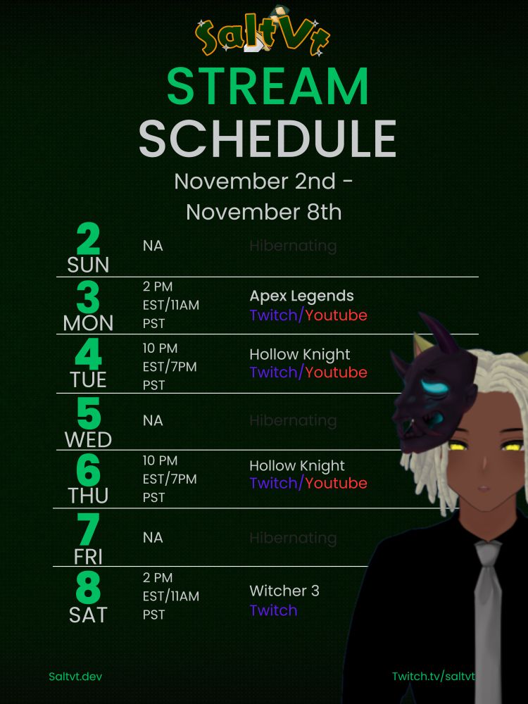 My name is Salt and I'm a Hacker/Cyber Vigilante Vtuber from the future!!! I do a bunch of things in my streams. Code, Cooking, Building/Designing Devices, and Gaming. I play alot of Variety games but I mostly dabble in FPS(Apex, OW, Halo, etc.)