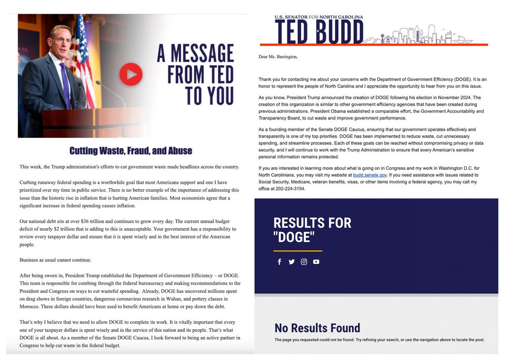 For a good sense of how congressional Republicans are changing their tune on Elon. Check out the different Ted Budd constituent letters from early February (left) to this past week (right)
