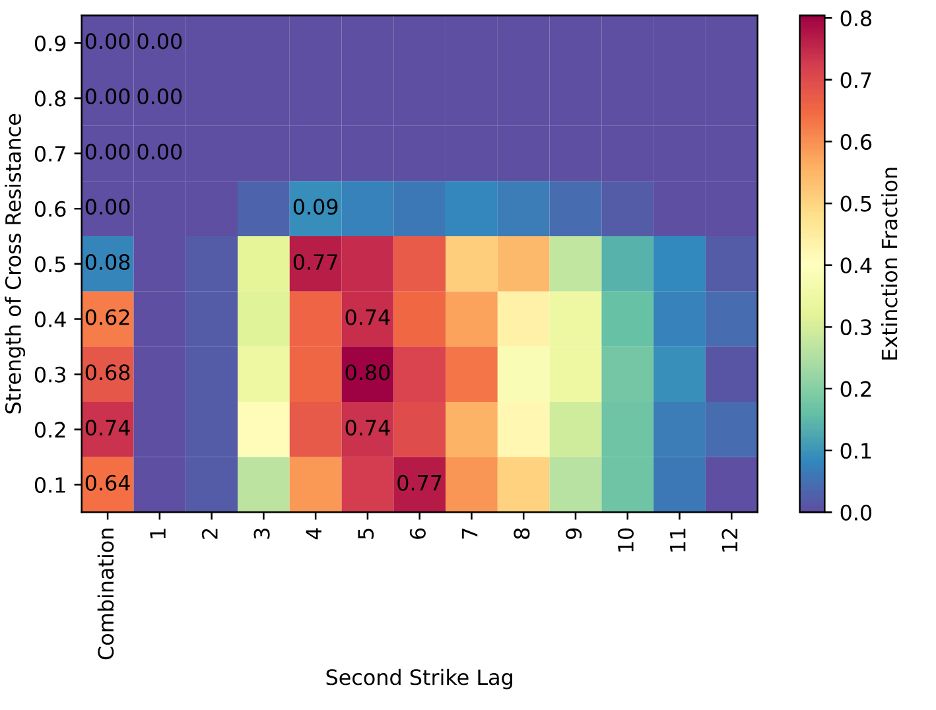 Wouldn’t it be better to use both treatments simultaneously, if possible? Sometimes, but if there is a single mechanism that can provide resistance to both (i.e. cross-resistance), then the sequential two-strike extinction therapy approach may beat combination therapy. See paper for more details!