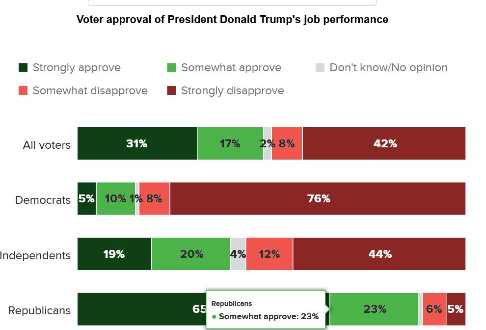 With independents its 39%-56%. More strongly disapprove - 44% - than approve.