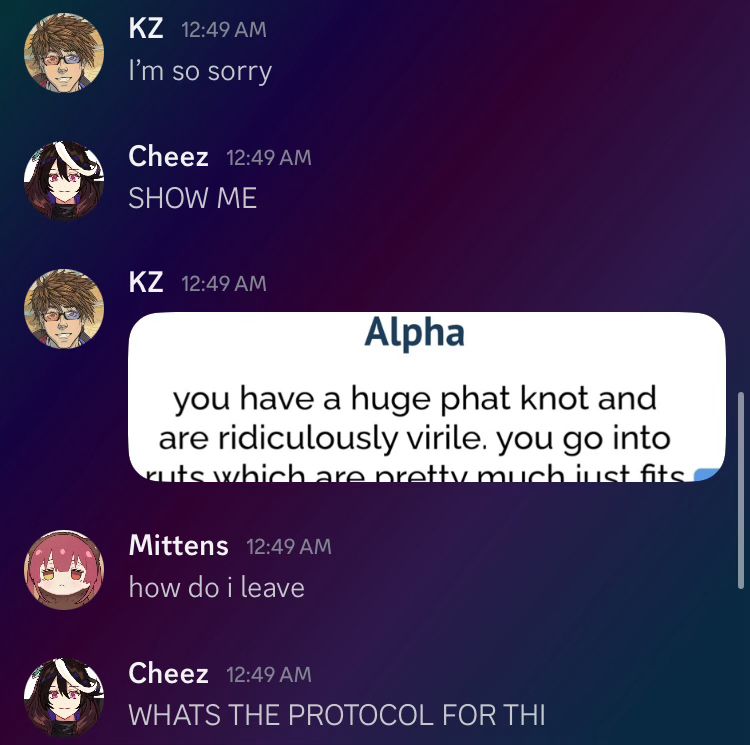 (We did the ABO quiz, Cheez and I got Alpha and Mittens got Omega)
