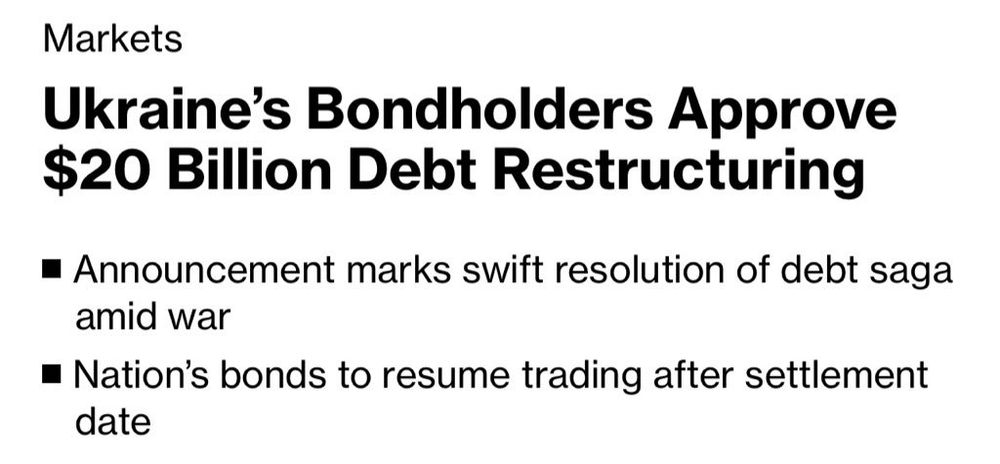 ✅ Ukraine’s bondholders approve $20 billion debt restructuring, - Bloomberg