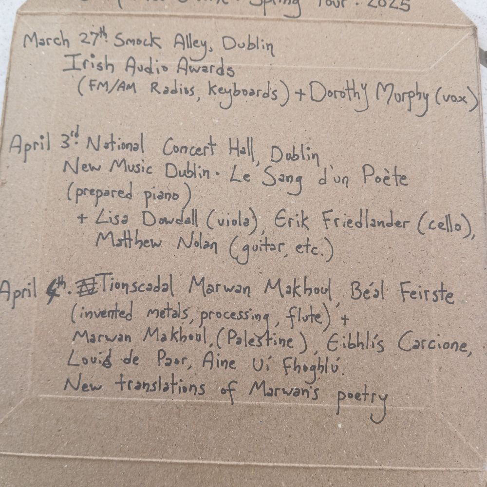 So many gigs on! Catch me tuning radios for the Irish Radio Awards, bowing steinway pianos at New Music Dublin, accompanying Palestinian poetry in Belfast or launching Adrian Crowley's new album...