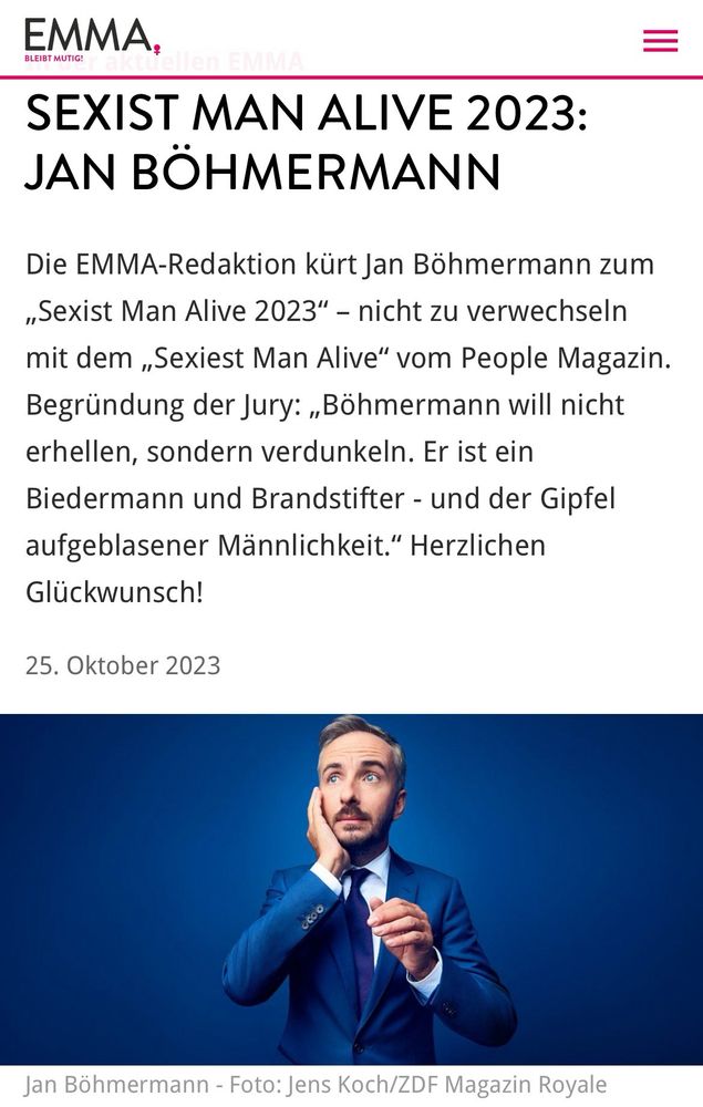 Die Emma-Redaktion ist auf ihrem reaktionären Tripp auf einer neuen Stufe angekommen. Von Böhmermann kann man viel halten, aber das hier ist sowas von konstruiert und sitzt im gleichen Abteil wie Nius und co.