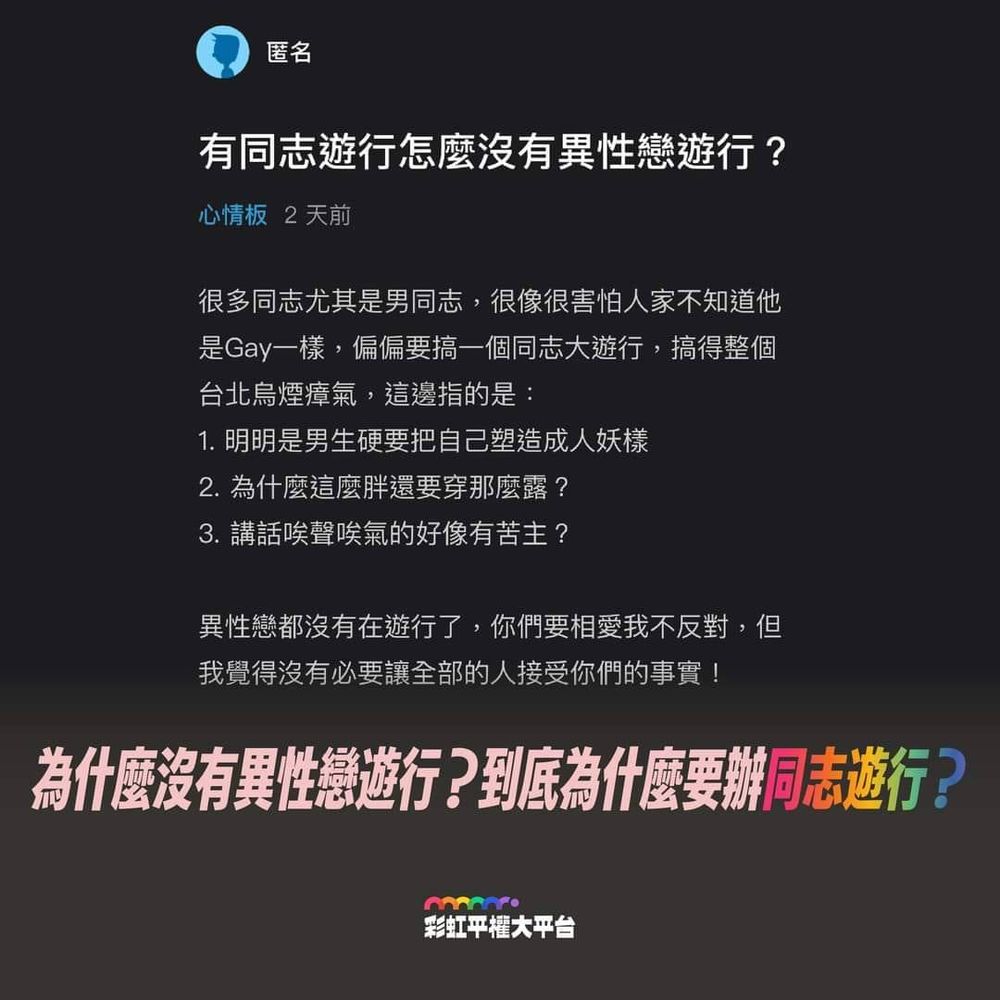 你可以辦異性戀遊行啊,奇怪,又沒人阻止你?