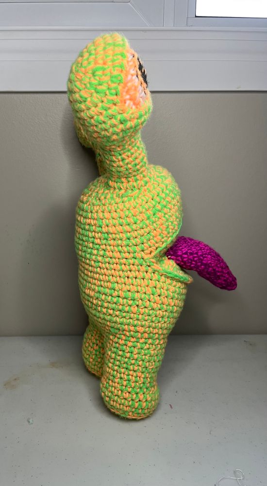 Features hand embroidered eyes, wefted and brushed Mohawk, and needle felted stripes. Pattern by Jess Huff.