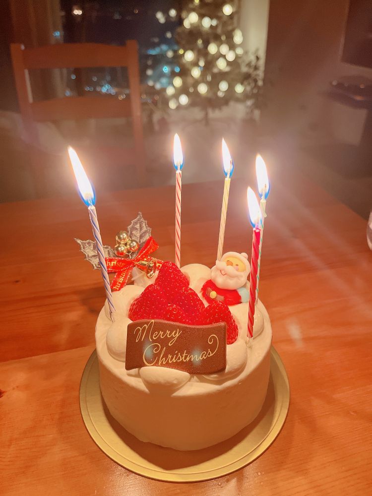 お子のリクエストで蝋燭を立てたクリスマスケーキ。これもうお誕生日のやつや。