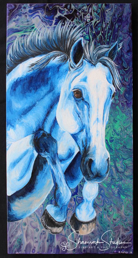 Throwback to 2017. I wanted to experiment with a monochromatic palette on the horse. I did an acrylic pour for the background. It's big - 12x24" not including the frame. It's available for purchase at the Southwest Virginia Cultural Center & Marketplace in Abingdon, VA.