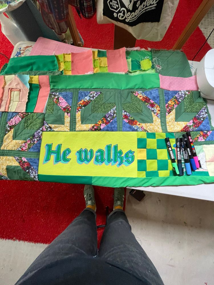 Going to go in with embroidery, buttons, and paint on the lime green blocks before sandwiching and finishing it.
