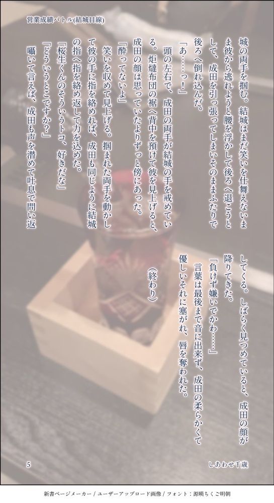 現在は「成田桜生(27)×結城竜介(32)」のサラリーマンカプと「栄心(20)×律(20)」の大学生カプを書いています。(不定期更新)