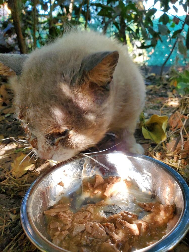 The crusty skin is breaking up and his fur is re-emerging. His pink irritated skin is more pale looking now 😁 He appears to be much happier too
