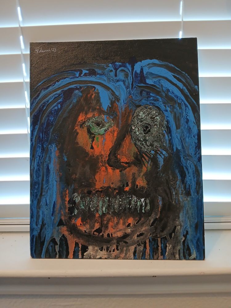 16" x 20" acrylics and mixed media. The spiral on his forehead is a piece of rubber I found on the service road! 🤣