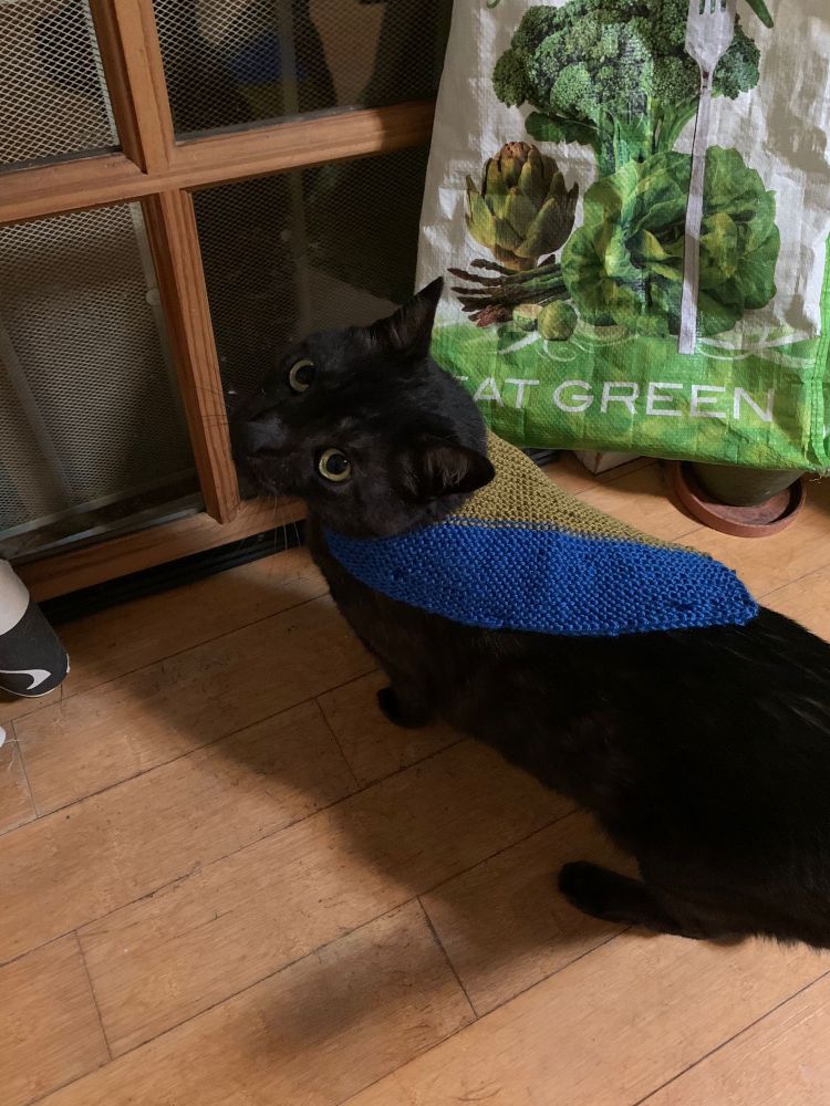Alt text: black cat wearing Ukrainian flag knit cape
