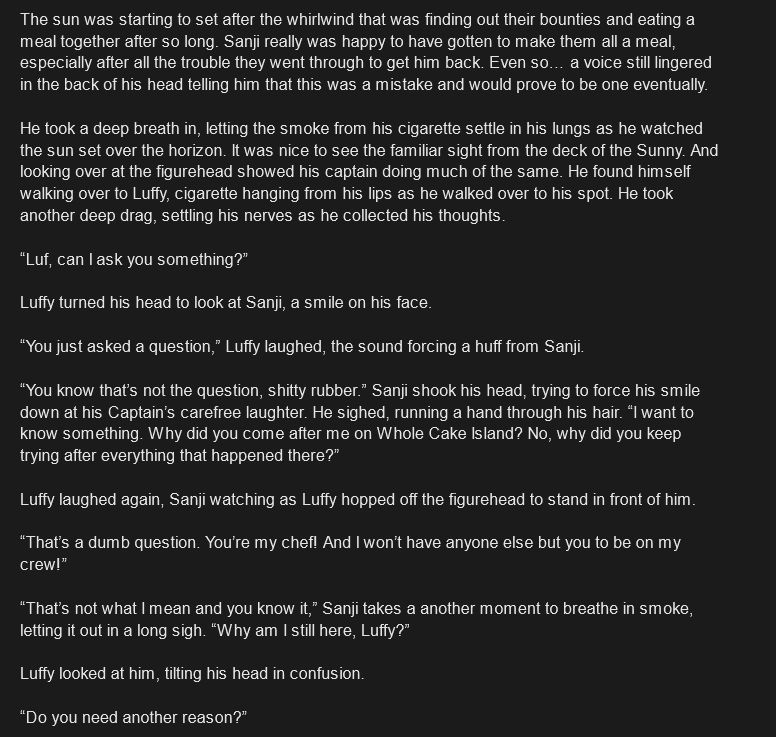 Here's the potential plan for a first chapter for the Cora Sanji and Toy Zoro AU