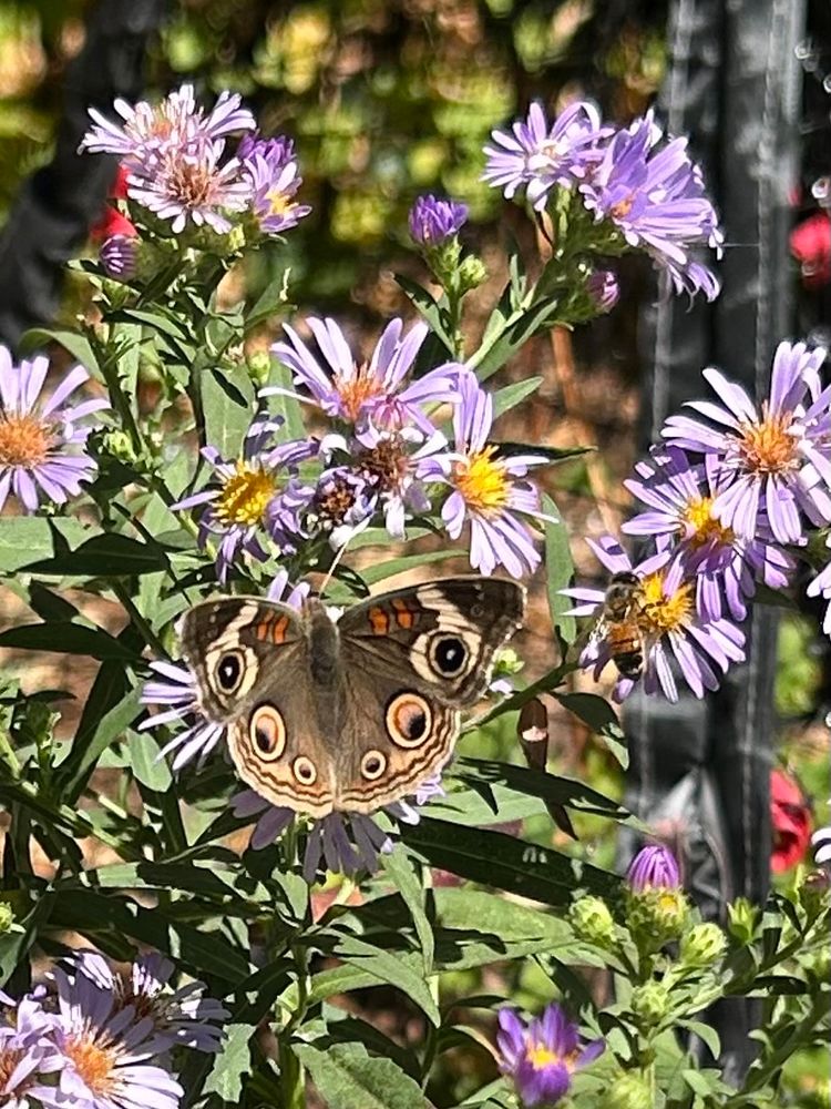 Grey Buckeye Butterfly (Junonia grisea) on California Asters (Symphyotrichum chilense) in my yard.