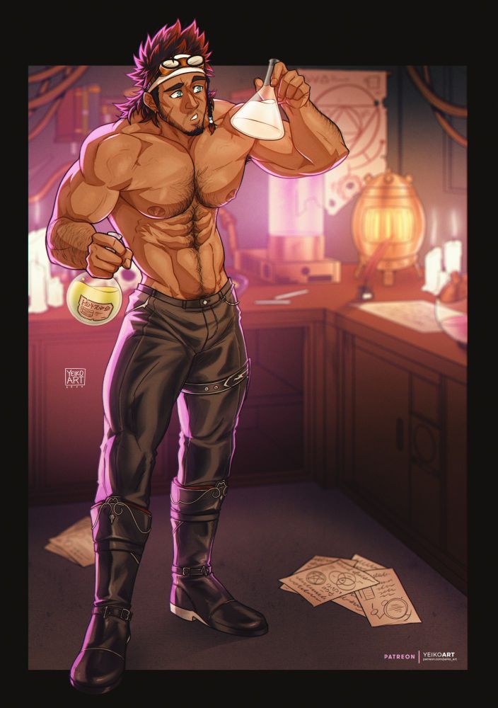 Matteo is an incredible alchemist, and he tries to perfect his little concoctions. this particular one is him developing aether infused paint to help his son protect himself since he is also a pictomancer, but not good at the magic part. ♥