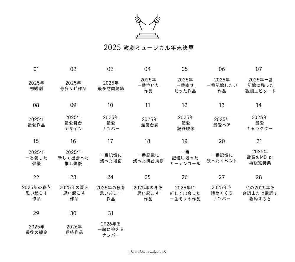 年末が近づくこの時期になると、一年を振り返った総括をする方が増えますが、私も今年はそんなみなさまにあやかって振り返りをしたいと思います。今回振り返りのネタとして使わせてもらうのが、韓国の演劇・ミュージカルオタクの間で流行っている パンッチャク(반짝)さんの『2025演劇ミュージカル年末決算』のアドベントカレンダー。1日の1つのお題が提供されて、お題に答えていくことによって自分の一年間の観劇ライフが...