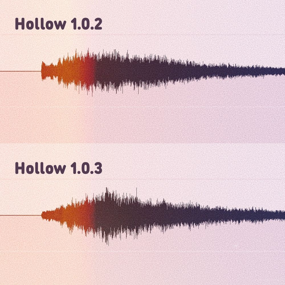 Hollow 1.0.3 is coming very soon for Mac, Windows and Linux - with an updated engine that has a much more natural, diffused reverb tail onset. What could be perceived as "dry input leakage" is now completely gone. Check out the notable difference in these two waveforms!