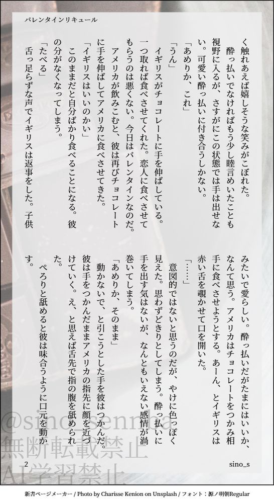 恋人同士の二人が仲良くチョコレートを食べているとイギがなぜか酔っ払ってしまって、彼に絡まれてしまうめりかの話です!