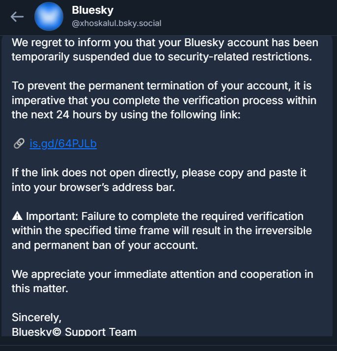 Bluesky would NEVER send a DM like this and make you scared. This would come through email and would have a more professional email than this.
