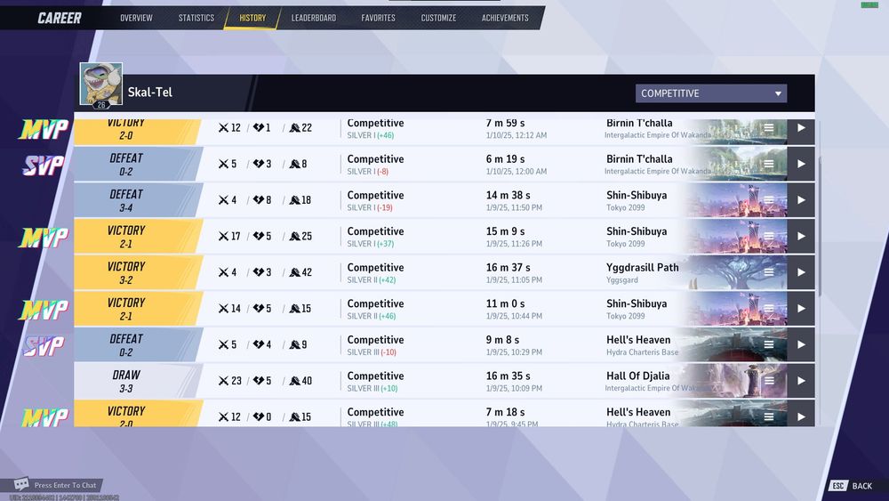 Here's the match history and character statistics.