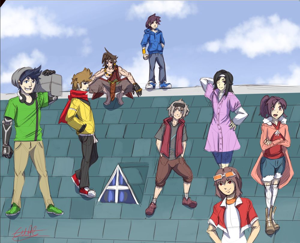 it's Royal Knight from left to right Chris Jolene Kyle, Melanie (Her eyes are red) , Ethan (he has robotic arms and he is the MC and Leader ) , Hollis (is a girl) , Dahlia and Tai