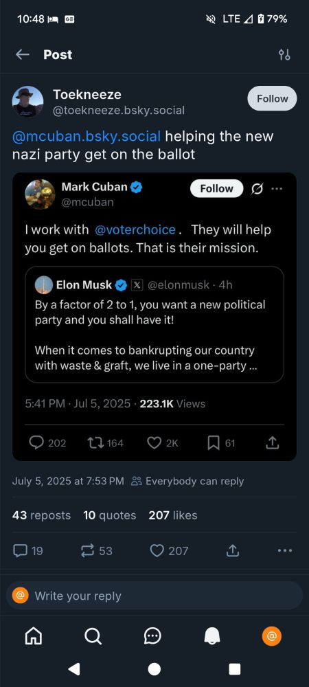 I followed the thread back to the original post and could you tell me what they were talking about here? I'm just a poor reading comprehension impaired weather formation made out of snark so I could be wrong but it seems like something about Cuban offering to help get Musk's new party on ballots?