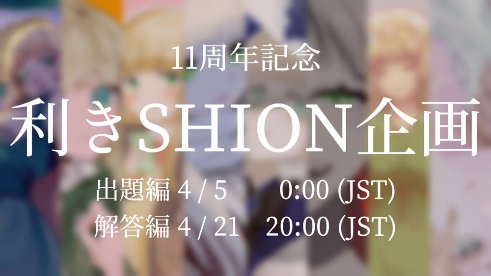 その記念に利き企画を開催し、11周年記念日の4月5日に出題編動画を、4月21日に解答編動画を投稿いたします。バリエーション豊かなSHIONさんを楽しめる動画となりましたので、投稿をお楽しみに!!