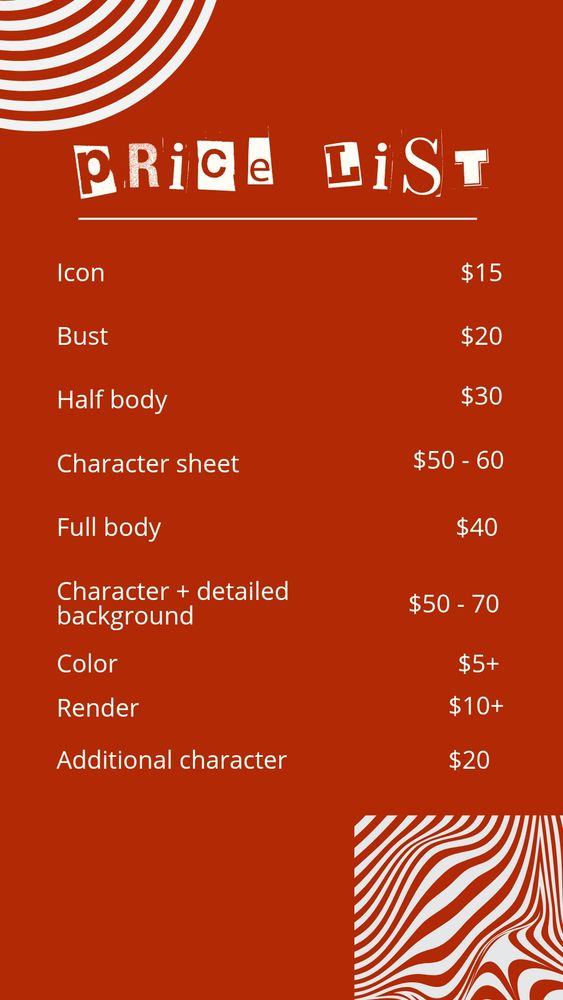 Oficialmente aberta pra comissões, eu vou deixar a tabela de preços aqui como quem não quer nada kk foi mal estar em inglês, tradução nos comentários.