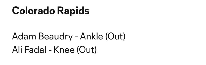 The Rapids remain relatively healthy. Nico Hansen is the new addition with a groin injury. Steffen being back just got more important. Jackson Travis is available after his questionable suspension. No surprises from Seattle, the long term injuries remain long term.