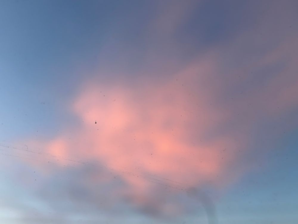 The sunrise this morning was another beautiful one, but I wasn’t able to get a good picture of it. The stop light turned green, and it was time to begin my trek to work. Anyway, I did get a quick picture of this fuzzy pink cloud.