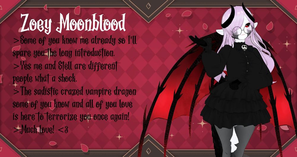 Some of you may know me, some of you may be here because of me! I'm Zoey Moonblood, I've done my own thing ELSEWHERE that some of you maaay or may not know about. Good to see you again!~ -Z