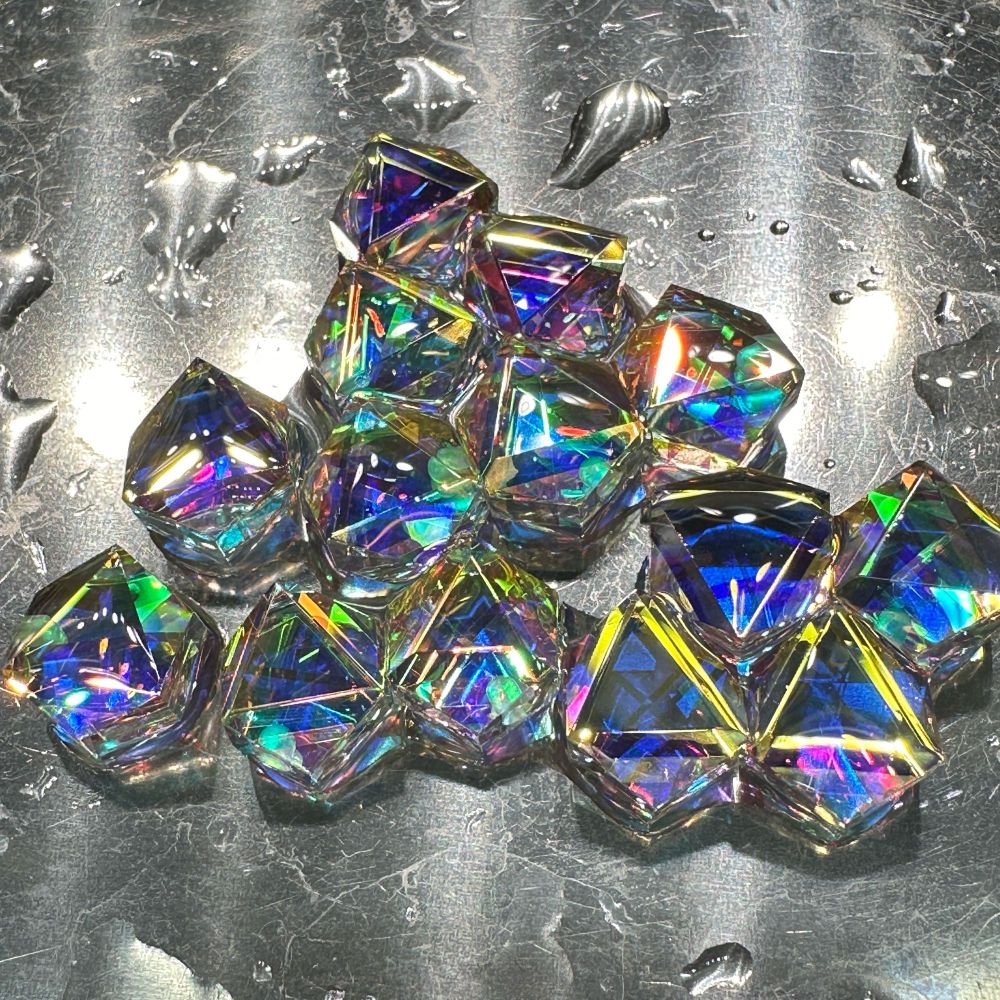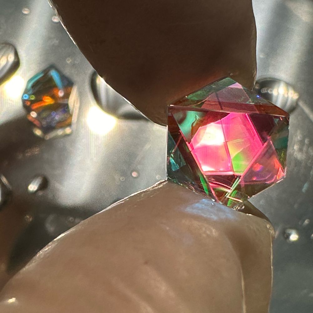 数十個ものダイクロイックミラーのパーツを貼り合わせ、丁寧に磨き上げられた作品。