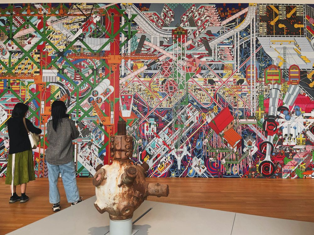 超高層ビルが立ち並ぶ超巨大金融都市セントラルを一望できる窓に向き合うように虚実混ざったバカデカ近未来構想絵画を背丈の倍はある壁面いっぱいに掲げて極め付けにそれらで挟むように万博の遺物を展示するっていうインスタレーション、端的に言って強気すぎるでしょ、キュレーターの鮮やかすぎる情念よ