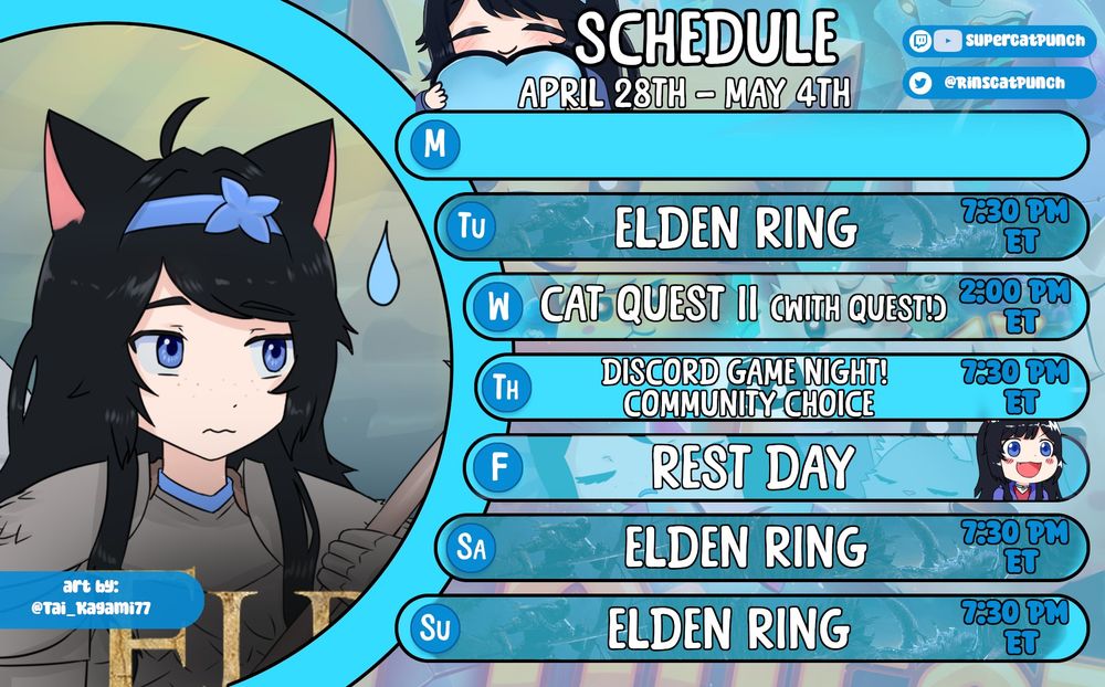 We are going to be streaming a lot this upcoming week to make up for lost game time! Sat+Sun is Dark Souls, and every day next week except Thursday (community night on Discord) we are playin games! 🥳
