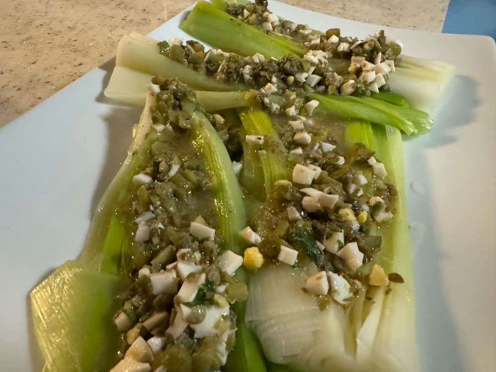 Leeks Vinaigrette with sauce grabiche from Boudain’s Les Halles cookbook