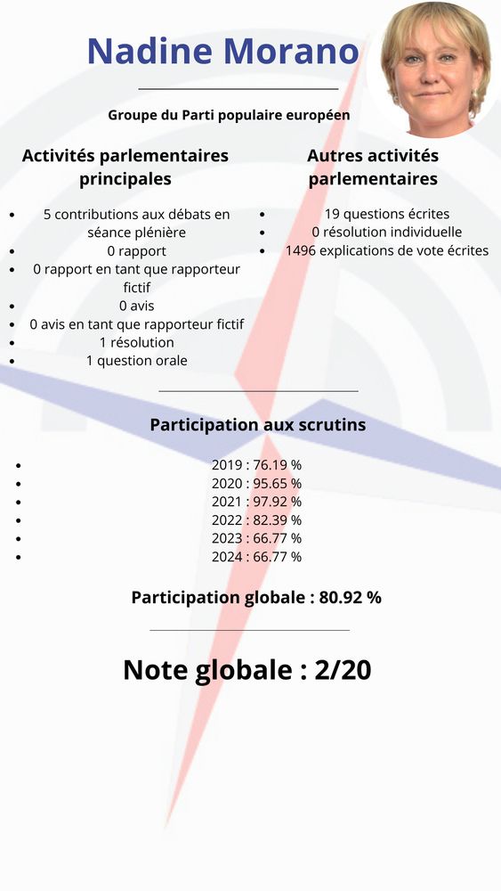 La plus inactive au Parlement européen ? Nadine Morano qui, grâce à sa remarquable inactivité, décroche un magnifique 2/20. Elle a plus souvent été dans les médias qu'au Parlement européen en cinq ans.