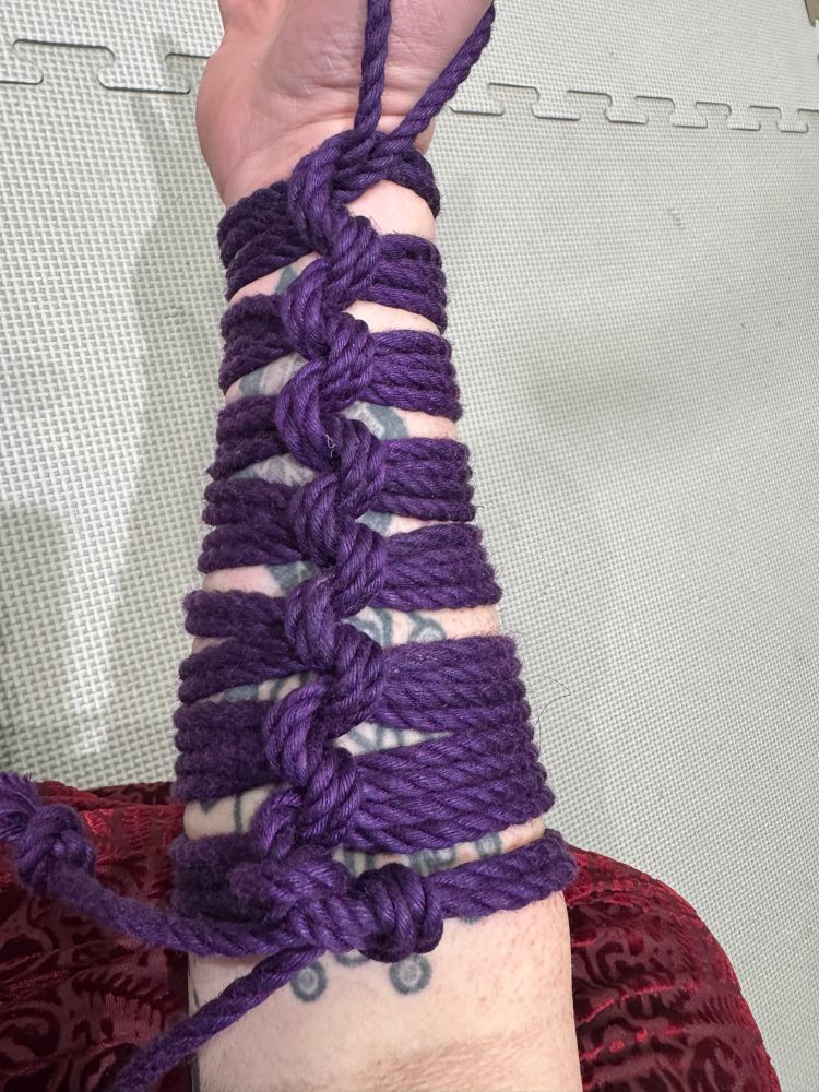 Gauntlet from rope workshop a few weeks ago. Going to play with the tie a bit to look at 2 colours and a want to look at adding a weave or something.