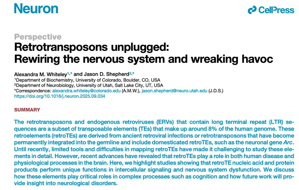 For obvious reasons, I've become fascinated with retrotransposons. So we ( @alexwhiteley.bsky.social and I) wrote an article now out in Neuron @cellpress.bsky.social on how we think retrotransposons influence brain function and health! kwnsfk27.r.eu-west-1.awstrack.me/L0/https:%2F...