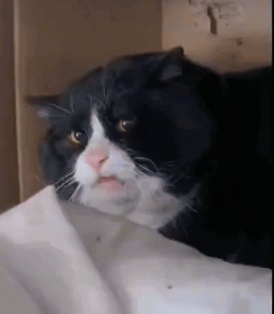 ALT: a black and white cat is sitting on a white blanket looking at the camera .