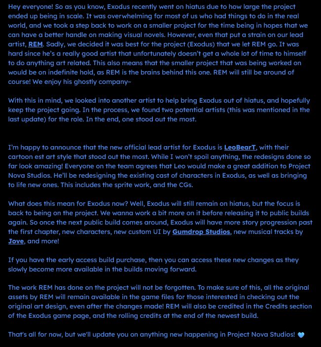 As you probably already know, development for Exodus has been rather slow. Our scope of the project is much bigger than we anticipated, especially for being our first project. So we’ve decided to put Exodus on hiatus for the time being.