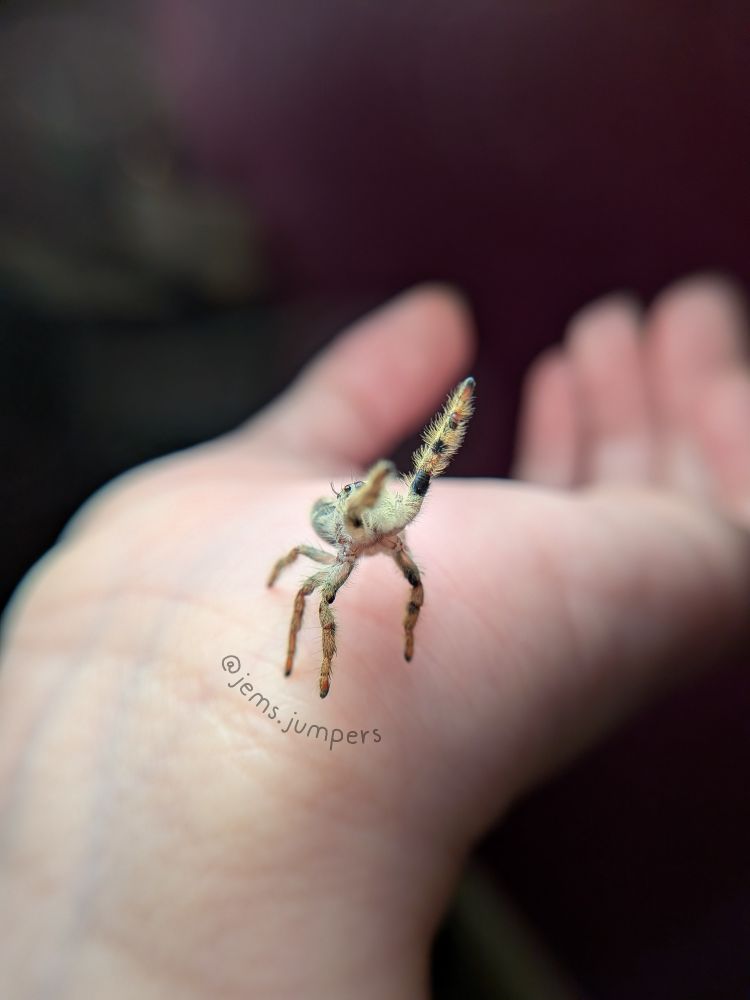 We'd like to introduce you to Mochi, a subadult Hyllus Diardi female. She's stunning and already loves hand time. Swipe for some cute uppie pics 🥹 #hyllusdiari #petspider #jumpingspider