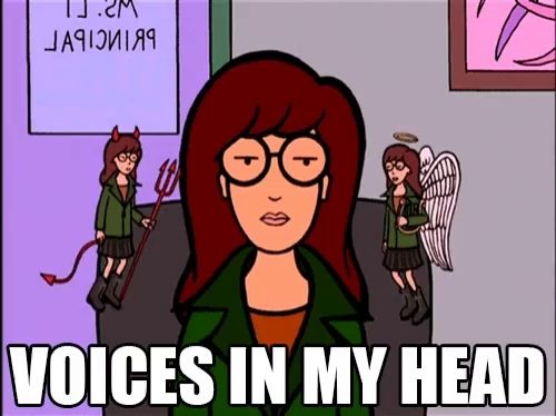 Alt: a cartoon of Daria with an angel and demon version of herself on each shoulder with the words "voices in my head" below her.