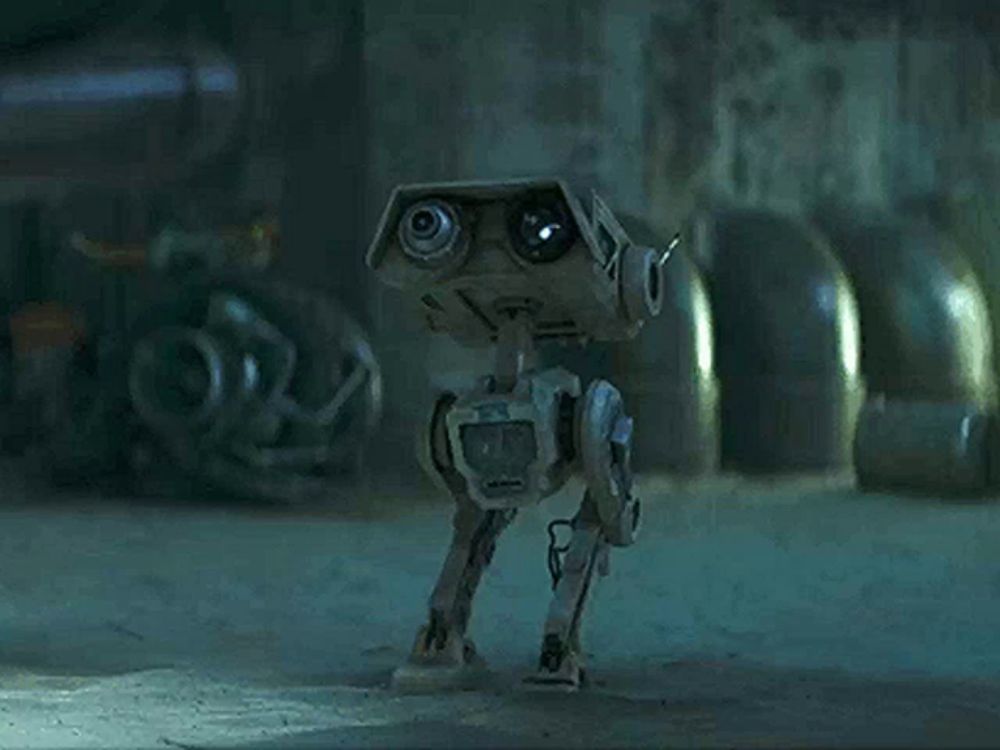 ALT: a robot with a camera on it 's head is walking on the ground in a dark room .