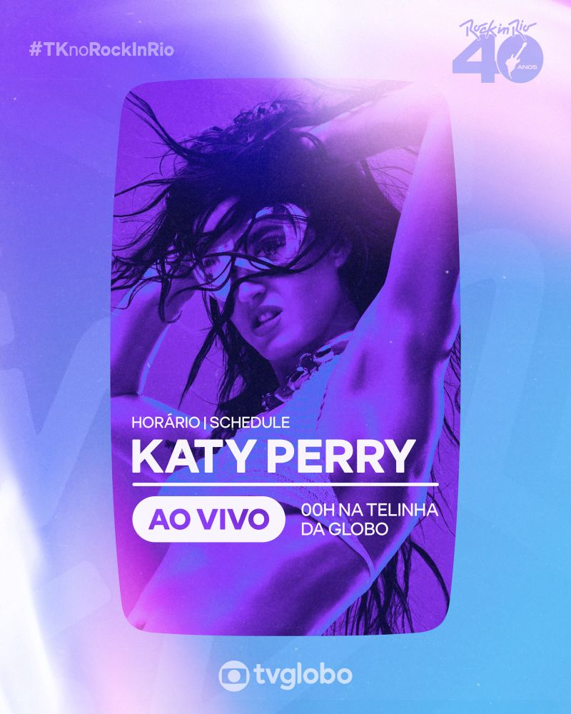 Hoje, às 23h55, Katy Perry sobe ao Palco Mundo do @RockinRio para o primeiro show da era '143'! E será transmitido no Globoplay e também na Rede Globo.