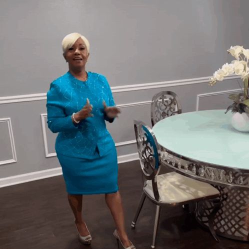 a woman in a blue suit stands in front of a table and chairs