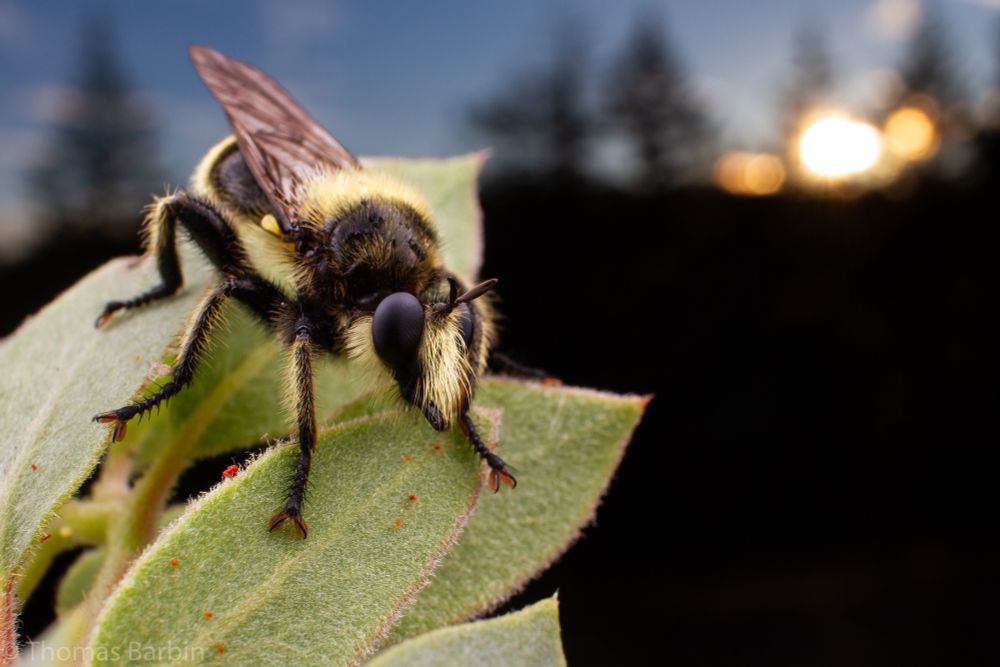 Laphria sp. Robberfly hanging out on a manzanita leaf on a summer evening. Not often I get to photograph these as they are quite flighty!