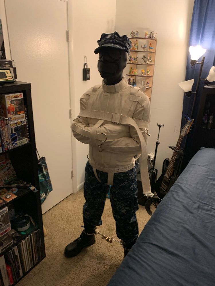 Tight cuffs, heavy leg irons, full isolation hood, and a few arm restraints to anchor him in place in the closet so he can sweat and strain! 😈