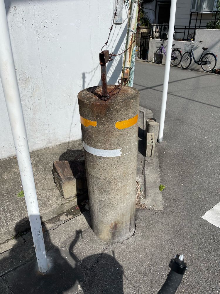 われそんし駅と、多分電柱だったモノと、停止線で止まると対向車が入って来れないので地元民が書いたであろう【さがれ】
